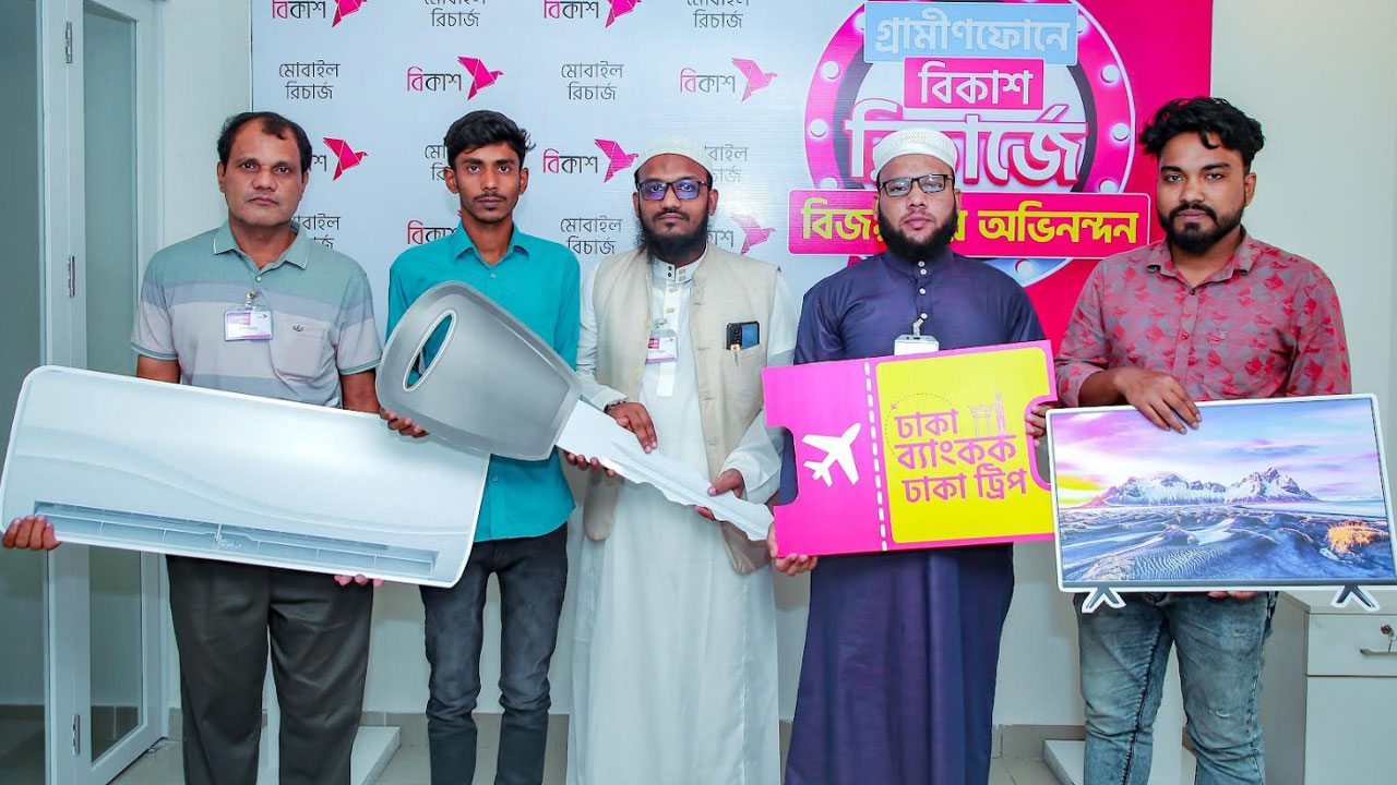 বিকাশ থেকে গ্রামীণফোন নম্বরে সর্বোচ্চ রিচার্জ করে গ্রাহকরা জিতে নিয়েছেন বাইক, এসি, টিভি এবং ঢাকা-ব্যাংকক-ঢাকা ও ঢাকা-কক্সবাজার-ঢাকা ভ্রমণের কুপন।