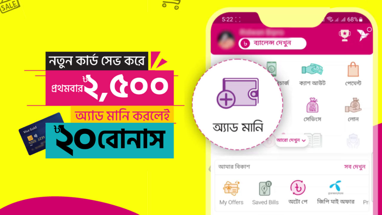 বিকাশ-এ ভিসা বা মাস্টারকার্ড সেভ করে অ্যাড মানি করলেই বোনাস