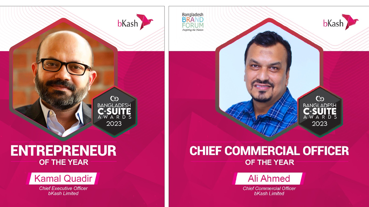 ‘বাংলাদেশ সি-স্যুট অ্যাওয়ার্ড ২০২৩’ এ ‘এন্ট্রাপ্রেনিউর অফ দ্য ইয়ার’ অ্যাওয়ার্ড পেয়েছেন বিকাশের প্রধান নির্বাহী কর্মকর্তা (সিইও) কামাল কাদীর। একইসঙ্গে বিকাশের প্রধান বাণিজ্যিক কর্মকর্তা (সিসিও) আলী আহম্মেদ পেয়েছেন “চিফ কমার্শিয়াল অফিসার অফ দ্য ইয়ার” অ্যাওয়ার্ড।