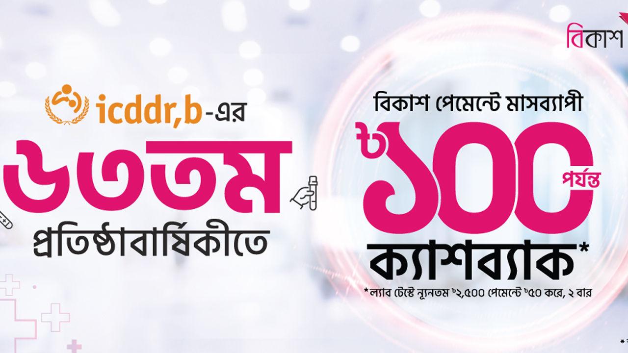 আইসিডিডিআরবির ল্যাব টেস্টে বিকাশ পেমেন্টে ১০০ টাকা ক্যাশব্যাক