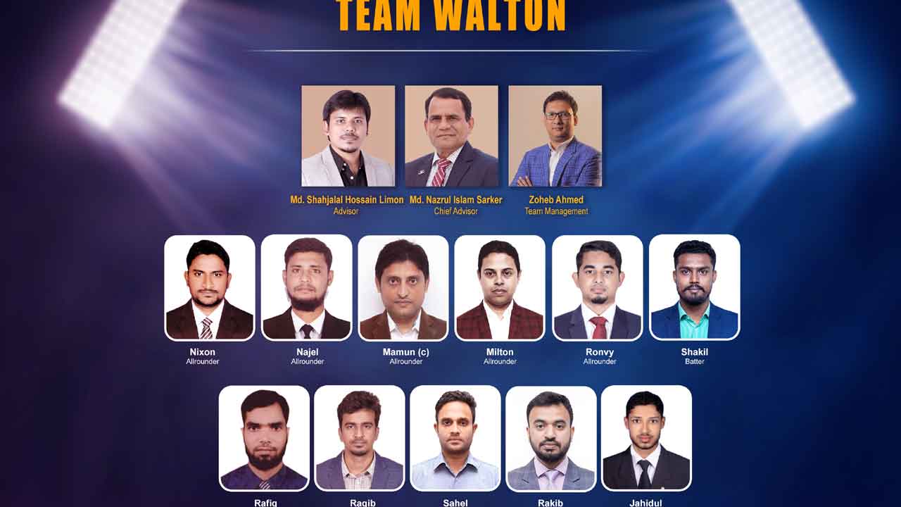 ওয়ালটন করপোরেট ক্রিকেট টিমের চিফ অ্যাডভাইজার হিসেবে আছেন মো. নজরুল ইসলাম সরকার, অ্যাডভাইজার শাহজালাল হোসেন লিমন এবং টিম ম্যানেজার জোহেব আহমেদ। টিম ওয়ালটনের ১১ সদস্য হলেন: আব্দুল্লাহ আল মামুন (অধিনায়ক), মো. সাজ্জাদ হোসেন (উইকেটরক্ষক), মিলটন, রনভী, সাহেল, নাজেল, নিক্সন, রফিক, রকিব, জহিরুল এবং রাকিব।