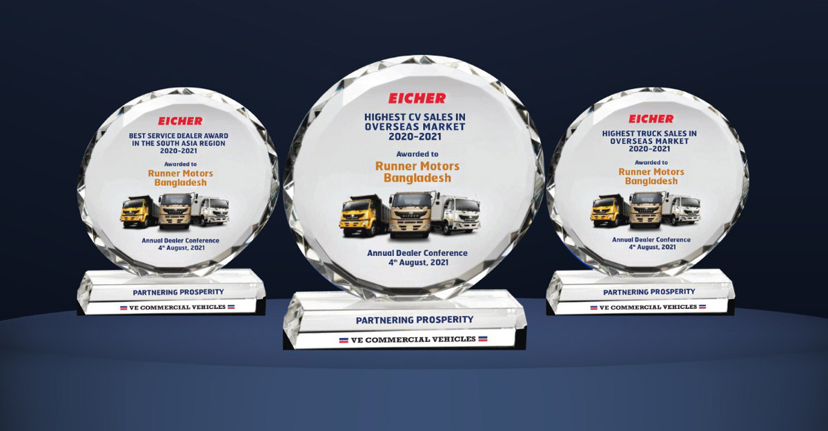 সম্প্রতি আইশার মোটরস লিমিটেড ইন্ডিয়া থেকে তিনটি পুরস্কার অর্জন করেছে রানার মোটরস লিমিটেড। ২০২০-২১ সালে (টানা ১৭তম বছর) আন্তর্জাতিক বাজারে সর্বোচ্চ বাণিজ্যিক যানবাহন বিক্রি, সর্বোচ্চ ট্রাক বিক্রি এবং দক্ষিণ এশিয়া অঞ্চলে ২০২০-২১ অর্থবছরের জন্য সেরা সার্ভিস ডিলার (টানা ৪র্থ বছর) পুরস্কার অর্জন করেছে প্রতিষ্ঠানটি।