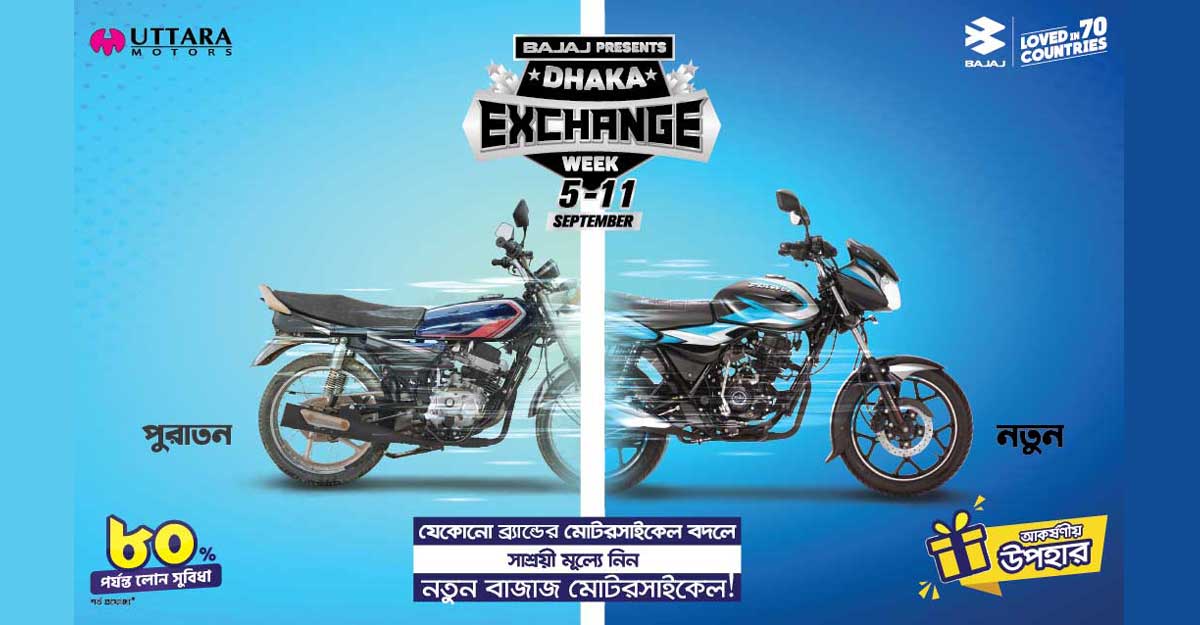 ঢাকা ও ঢাকার আশপাশের সাভার, গাজীপুর, টাঙ্গাইল, মানিকগঞ্জ এবং নারায়ণগঞ্জ জেলায় উত্তরা মোটর্সের অনুমোদিত নির্দিষ্ট ১৬টি ডিলারের শোরুমে সাত দিনের জন্য চলবে এই ‘বাজাজ ঢাকা এক্সচেঞ্জ উইক’।