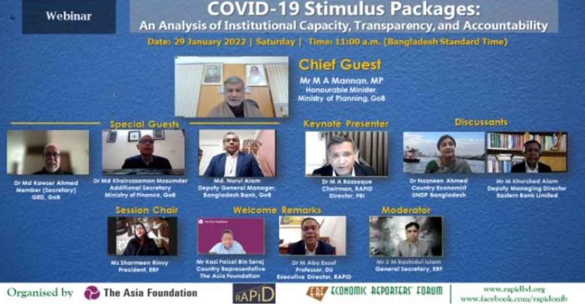 শনিবার (২৯ জানুয়ারি) ‘কোভিড-১৯ প্রণোদনা প্যাকেজ : প্রাতিষ্ঠানিক দক্ষতা, স্বচ্ছতা ও জবাবদিহিতা’ শীর্ষক আলোচনা সভায় বক্তারা এমন মতামত দিয়েছেন। এশিয়া ফাউন্ডেশন, ইকোনোমিক রিপোর্টার্স ফোরাম (ইআরএফ) ও গবেষণা সংস্থা র্যাপিড যৌথভাবে অনলাইনে এ আলোচনা সভার আয়োজন করে।