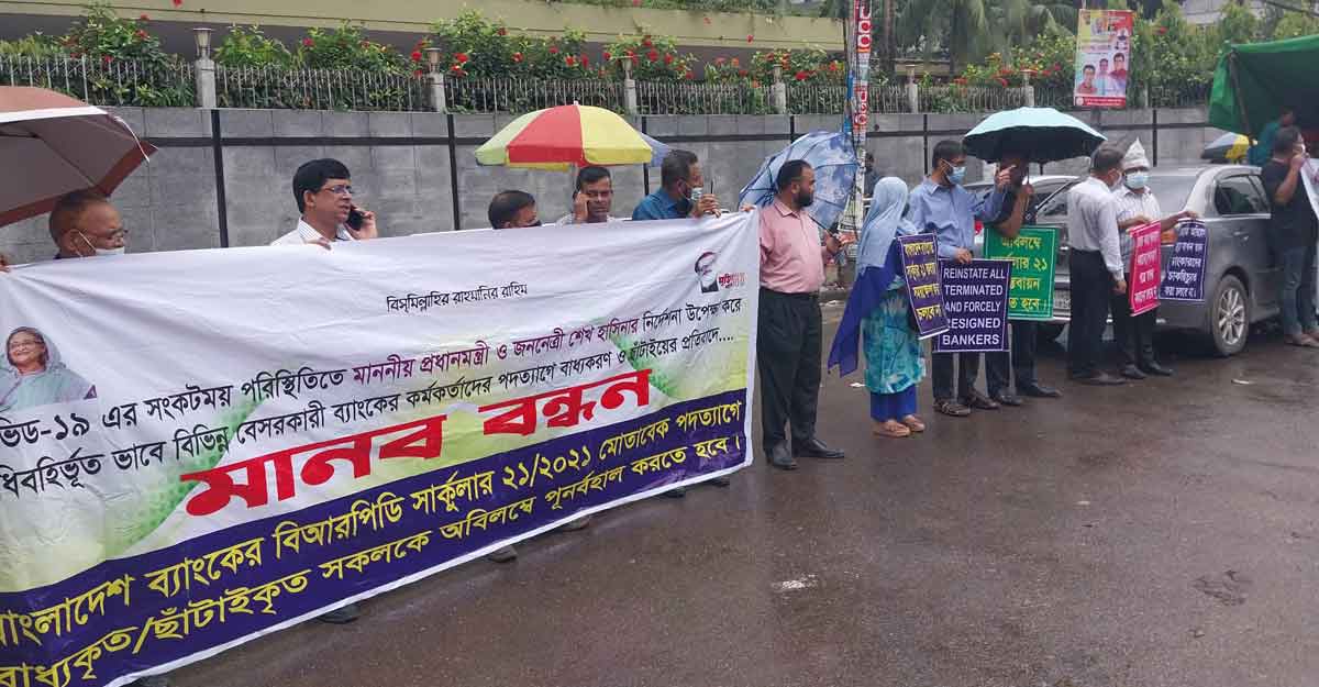 মানববন্ধন কর্মসূচিতে ছাঁটাই ও পদত্যাগে বাধ্য হওয়া ব্যাংকাররা জানান, করোনার সময় অন্যায় ও অমানবিকভাবে বিভিন্ন বেসরকারি ব্যাংক কয়েক হাজার কর্মীকে পদত্যাগ করতে বাধ্য ও ছাঁটাই করে।