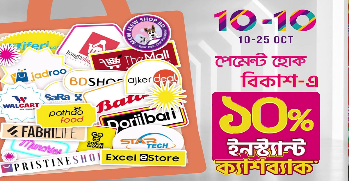 ১০-১০ অনলাইন শপিং উৎসবে বিকাশের ১০% ইনস্ট্যান্ট ক্যাশব্যাক