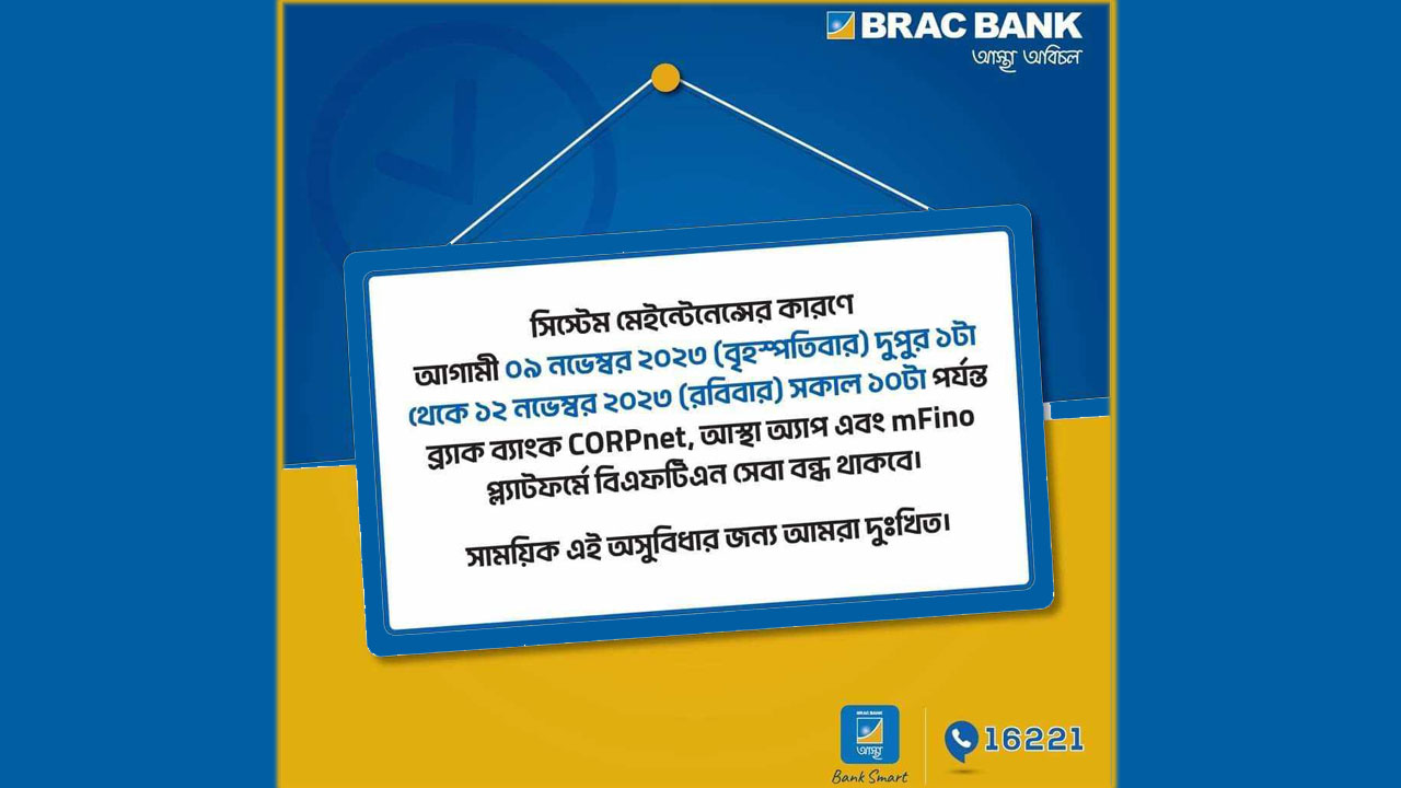 সিস্টেম মেইটেন্যান্স অর্থাৎ ন্যাশনাল পেমেন্ট সুইচ বাংলাদেশের (এনপিএসবি) কারিগরি উন্নয়নের জন্য ব্র্যাক ব্যাংক পিএলসির ‘আস্থা’, ‘করপনেট’ অ্যাপ ও এমফিনো সেবা কার্যক্রম তিন দিন বন্ধ থাকবে।