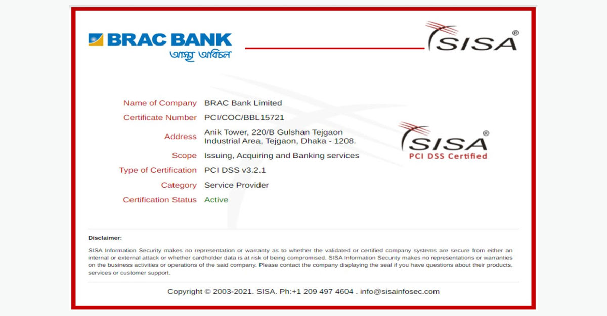 শক্তিশালী সিস্টেম, উন্নত নেটওয়ার্ক সিকিউরিটি ব্যবস্থা, নিয়মিত পর্যবেক্ষণ ও রক্ষণাবেক্ষণ নিশ্চিত করার মাধ্যমে সম্প্রতি ওই সূচক অনুযায়ী পিসিআই-ডিএসএস সার্টিফিকেট অর্জন করেছে ব্র্যাক ব্যাংক। পিসিআই-ডিএসএস হলো কার্ড হোল্ডারের ডাটা সঞ্চয়, প্রক্রিয়াজাত ও প্রেরণকারী প্রতিষ্ঠানগুলোর জন্য সুরক্ষিত মানদণ্ডের একটি স্ট্যান্ডার্ড।