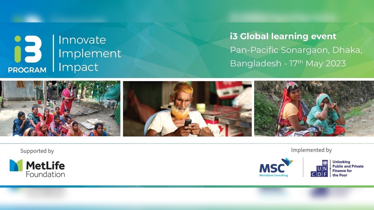 ঢাকায় অনুষ্ঠিত হয়েছে ‘ইনোভেশন ইন ফাইন্যান্সিয়াল প্রোডাক্টস টু এনহান্স পিপলস রেজিলিয়েন্স’ শীর্ষক আই থ্রি (ইনোভেট, ইমপ্লিমেন্ট, ইমপ্যাক্ট) গ্লোবাল লার্নিং। এই আয়োজনে মালয়েশিয়া, চীন, ভিয়েতনাম ও বাংলাদেশ এই চারটি দেশের আর্থিক সহনশীলতা ও নিরাপত্তা বিষয়ে অর্জিত বাস্তবমুখী অভিজ্ঞতাসমূহের ওপর আলোকপাত করা হয়।