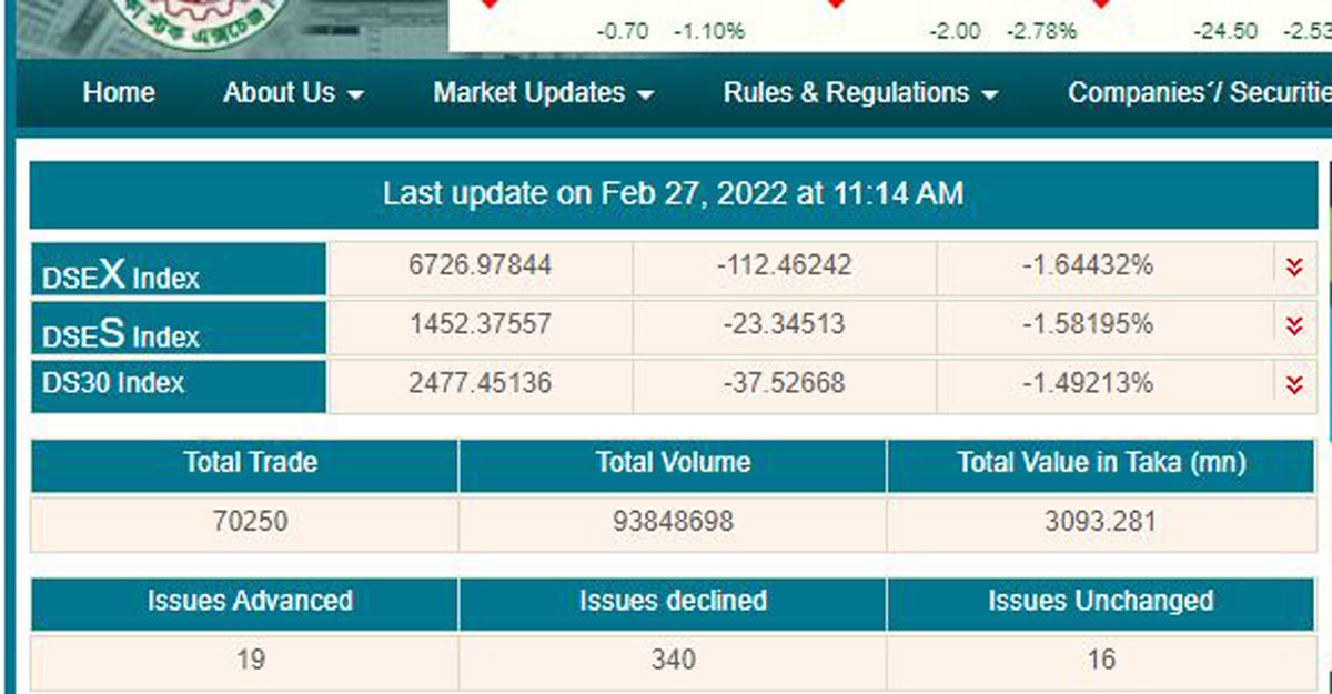 সপ্তাহের প্রথম কার্যদিবসে রোববার (২৭ ফেব্রুয়ারি) দেশের পুঁজিবাজারে সূচকের পতনের মধ্য দিয়ে লেনদেন চলছে। এর ফলে লেনদেনের সোয়া এক ঘণ্টায় বেশির ভাগ কোম্পানির শেয়ারের দাম কমেছে। তাতে দেশের প্রধান পুঁজিবাজার ঢাকা স্টক এক্সচেঞ্জের (ডিএসই) সূচক কমেছে ১১২ পয়েন্ট।