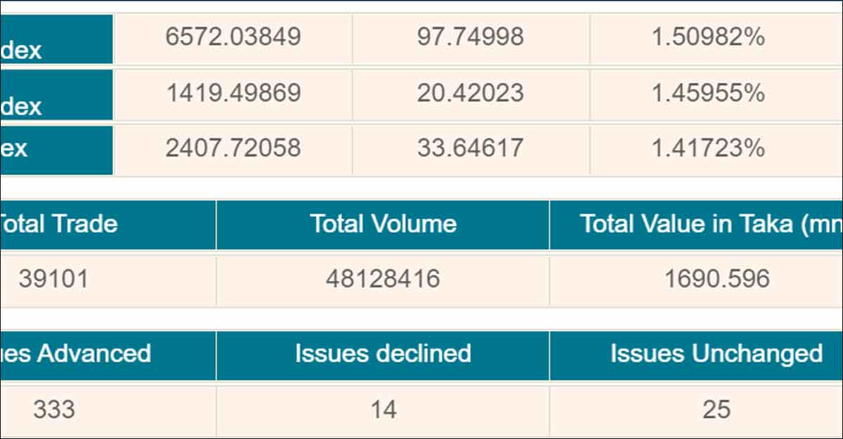 ডিএসইর তথ্য অনুযায়ী, বুধবার সকাল ১০টা থেকে সাড়ে ১০টা পর্যন্ত সময়ে ডিএসইর প্রধান সূচক ডিএসইএক্স ১১৪ দশমিক ৮ পয়েন্ট বেড়ে ৬ হাজার ৫৮৮ পয়েন্টে দাঁড়িয়েছে। অপর দুই সূচকের মধ্যে ডিএসইএস সূচক বেড়েছে ২৫ দশমিক ৮৫ পয়েন্ট। ডিএস-৩০ সূচক আগের দিনের চেয়ে বেড়েছে ৪০ দশমিক ৯৩ পয়েন্ট।