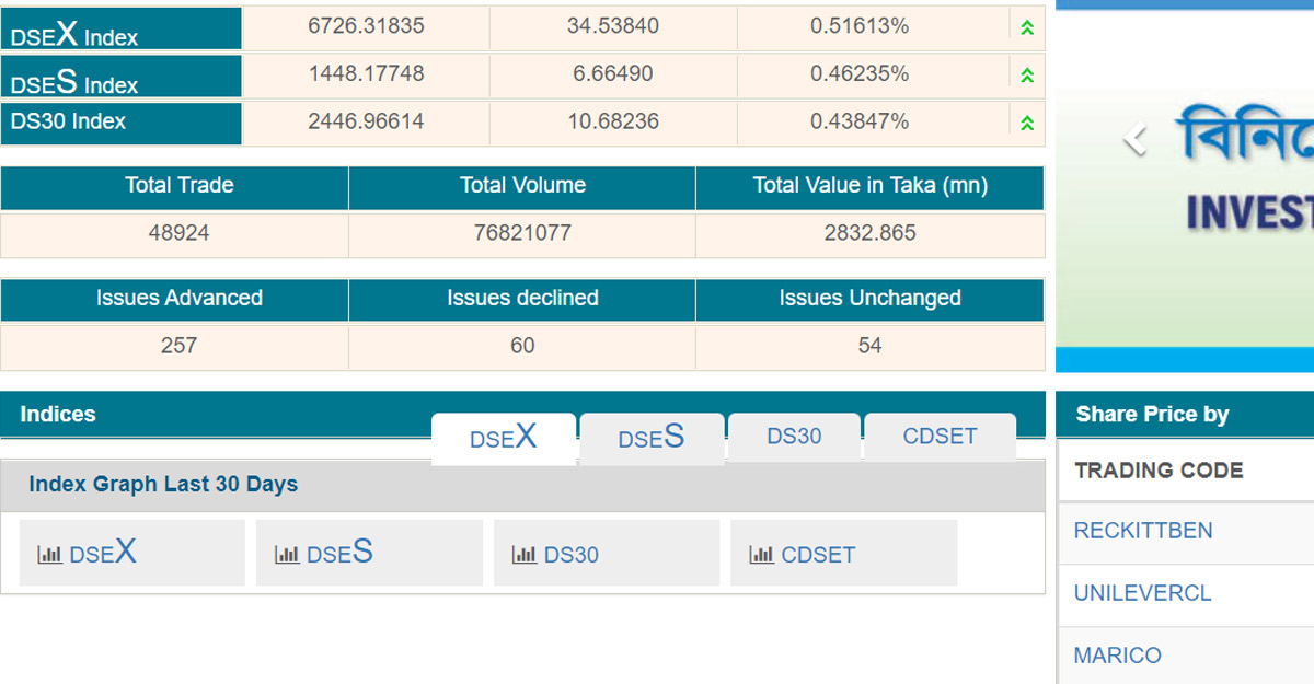এ সময়ে ডিএসইর প্রধান সূচক ডিএসইএক্স ৩৪ দশমিক ৮৬ পয়েন্ট বেড়ে ৬ হাজার ৭২৬ পয়েন্টে দাঁড়িয়েছে। অপর দুই সূচকের মধ্যে ডিএসইএসর সূচক বেড়েছে ৫ দশমিক ৮১ পয়েন্ট আর ডিএস-৩০ সূচক আগের দিনের চেয়ে বেড়েছে ৯ দশমিক ৬২ পয়েন্ট। প্রথম ঘণ্টায় ডিএসইতে লেনদেন হয়েছে ২১২ কোটি ১৫ লাখ ৫৩ হাজার টাকা।