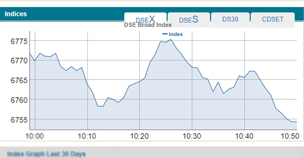 ডিএসইর তথ্য অনুযায়ী, সোমবার সকাল ১০টা থেকে ১০টা ৩০ মিনিট পর্যন্ত সময়ে ডিএসইতে ৩২৫টি প্রতিষ্ঠানের মোট ২ কোটি ৮২ লাখ ৩৮ হাজার টাকার ৩৪০টি শেয়ার ও ইউনিটের লেনদেন হয়েছে। এ সময়ে ডিএসইর প্রধান সূচক ডিএসইএক্স ৩ দশমিক ৮২ পয়েন্ট কমে ছয় হাজার ৭৬৮ পয়েন্টে দাঁড়িয়েছে।