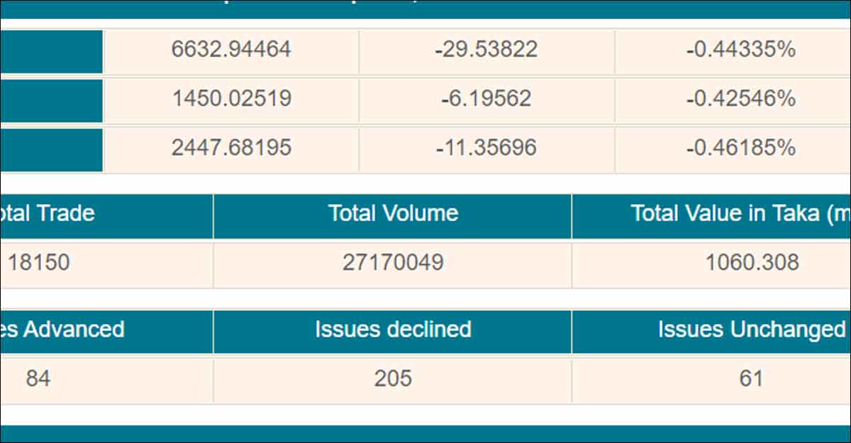 ডিএসইর তথ্য অনুযায়ী, সকাল ১০টা থেকে সাড়ে ১০টা পর্যন্ত সময়ে ৩২৪টি প্রতিষ্ঠানের মোট ২ কোটি ১৪ লাখ ৪৪ হাজার ৪৫২টি শেয়ার ও ইউনিটের লেনদেন হয়েছে। এ সময়ে ডিএসইর প্রধান সূচক ডিএসইএক্স ১৯ দশমিক ৬৯ পয়েন্ট কমে ছয় হাজার ৬৪২ পয়েন্টে দাঁড়িয়েছে।