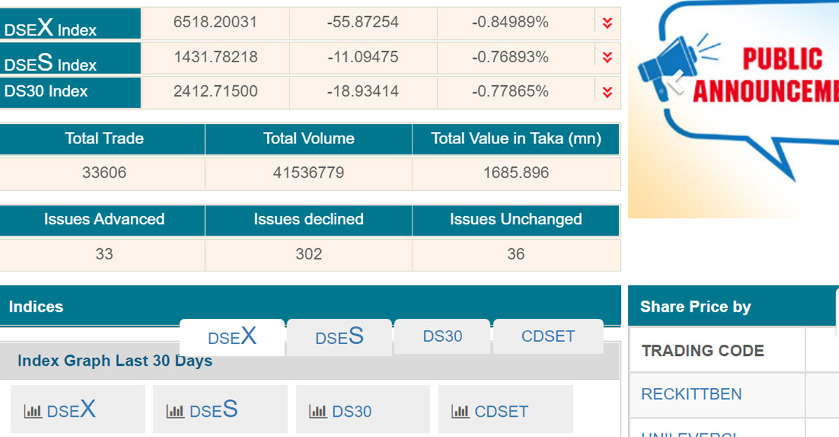 ডিএসইর তথ্য অনুযায়ী, সকাল ১০টা থেকে ১১টা পর্যন্ত সময়ে ৩৬৪টি প্রতিষ্ঠানের মোট ৩ কোটি ২২ লাখ ৪ হাজার ৩০৪টি শেয়ার ও ইউনিটের লেনদেন হয়েছে। এ সময়ে ডিএসইর প্রধান সূচক ডিএসইএক্স ৫১ পয়েন্ট কমে ছয় হাজার ৫২২ পয়েন্টে দাঁড়িয়েছে।