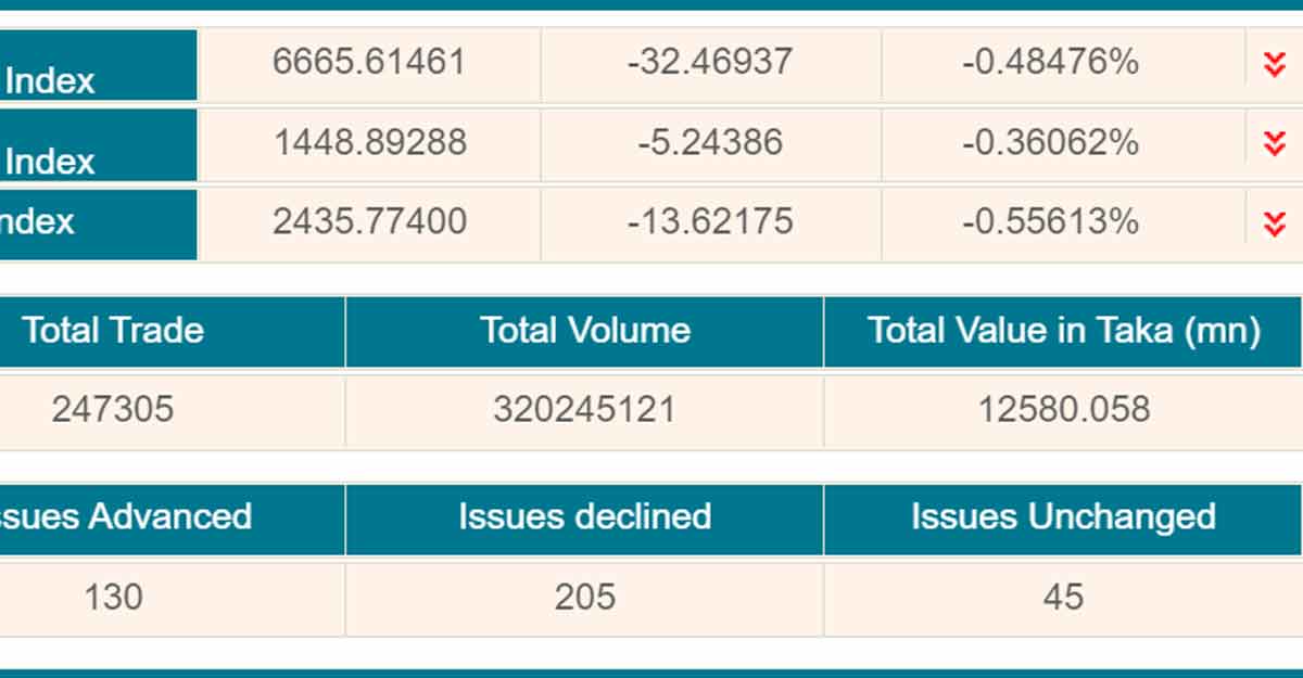 অধিকাংশ কোম্পানির শেয়ারের দাম কমায় এদিন ডিএসইর প্রধান সূচক আগের দিনের চেয়ে ৩২ দশমিক ৫৬ পয়েন্ট কমে ৬ হাজার ৬৬৫ পয়েন্টে দাঁড়িয়েছে। অপর দুই সূচকের মধ্যে ডিএসইএক্স আগের দিনের চেয়ে কমেছে ৫ পয়েন্ট এবং ডিএস-৩০ সূচক কমেছে ১৩ পয়েন্ট।