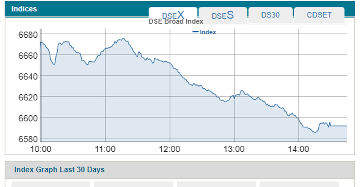 অধিকাংশ কোম্পানির শেয়ারের দাম কমায় এদিন ডিএসইর প্রধান সূচক আগের দিনের চেয়ে ৭৩ দশমিক ৬২ পয়েন্ট কমে ৬ হাজার ৫৯১ পয়েন্টে দাঁড়িয়েছে। অপর দুই সূচকের মধ্যে ডিএসইএক্স আগের দিনের চেয়ে কমেছে ১৫ পয়েন্ট এবং ডিএস-৩০ সূচক কমেছে ১৫ পয়েন্ট।