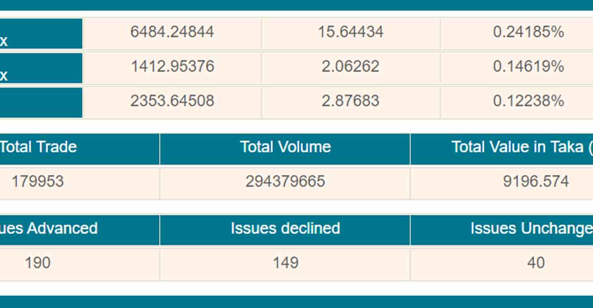 অধিকাংশ কোম্পানির শেয়ারের দাম বাড়ায় এদিন ডিএসইর প্রধান সূচক আগের দিনের চেয়ে ১৫ দশমিক ৬৪ পয়েন্ট বেড়ে ৬ হাজার ৪৮৪ পয়েন্টে দাঁড়িয়েছে। অপর দুই সূচকের মধ্যে ডিএসইএক্স আগের দিনের চেয়ে বেড়েছে ২ পয়েন্ট এবং ডিএস-৩০ সূচক বেড়েছে ২ পয়েন্ট।