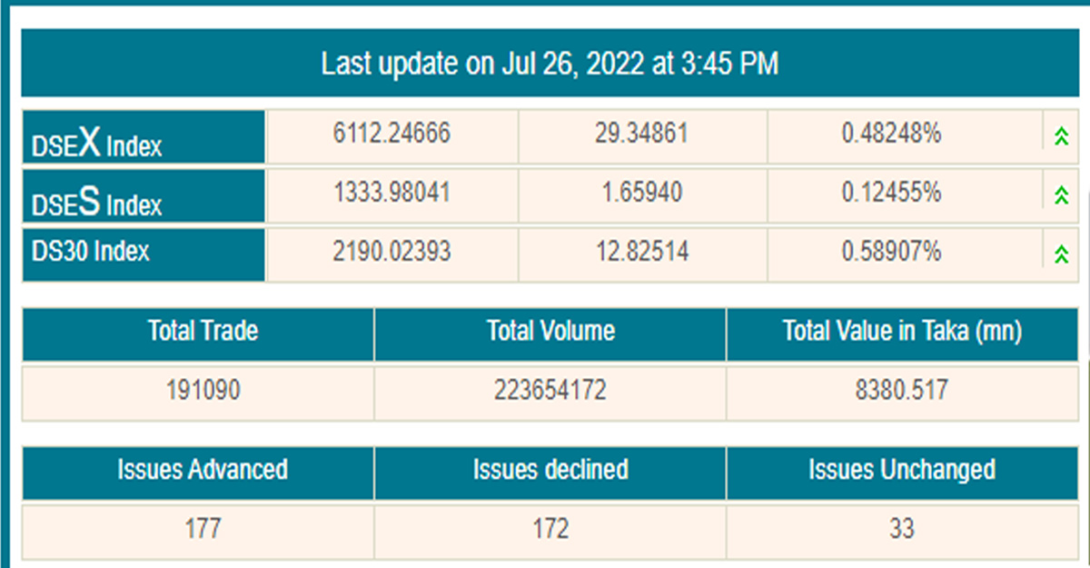 এ দিন ৩৮২টি প্রতিষ্ঠানের শেয়ার লেনদেন হয়েছে। এর মধ্যে দাম বেড়েছে ১৭৭টির, কমেছে ১৭২টির আর অপরিবর্তিত রয়েছে ৩৩টি কোম্পানির শেয়ারের দাম। অধিকাংশ কোম্পানির শেয়ারের দাম বাড়ায় প্রধান সূচক ডিএসইএক্স ২৯ পয়েন্ট বেড়ে ৬ হাজার ১১২ পয়েন্টে দাঁড়িয়েছে। ডিএসইএস সূচক ১ দশমিক ৬৫ পয়েন্ট বেড়ে ১ হাজার ৩৩৩ পয়েন্টে এবং ডিএস-৩০ সূচক ১২ পয়েন্ট বেড়ে ২ হাজার ১৯০ পয়েন্টে দাঁড়িয়েছে।
