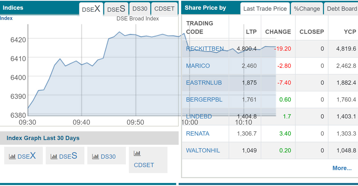 ডিএসইর তথ্য মতে, আজ বিক্রেতার তুলনায় ক্রেতা বেশি থাকায় লেনদেন হওয়া প্রায় সব কোম্পানির শেয়ারের দাম বেড়েছে। সকাল সাড়ে ৯টা থেকে ১০টা পর্যন্ত সময়ে ডিএসইতে ৩৫৬টি প্রতিষ্ঠানের শেয়ার ও ইউনিট কেনাবেচা হয়েছে। এর মধ্যে ২৫৯টি প্রতিষ্ঠানের শেয়ারের দাম বেড়েছে, কমেছে ৩২টির ও অপরিবর্তিত রয়েছে ৬৫টির দাম।