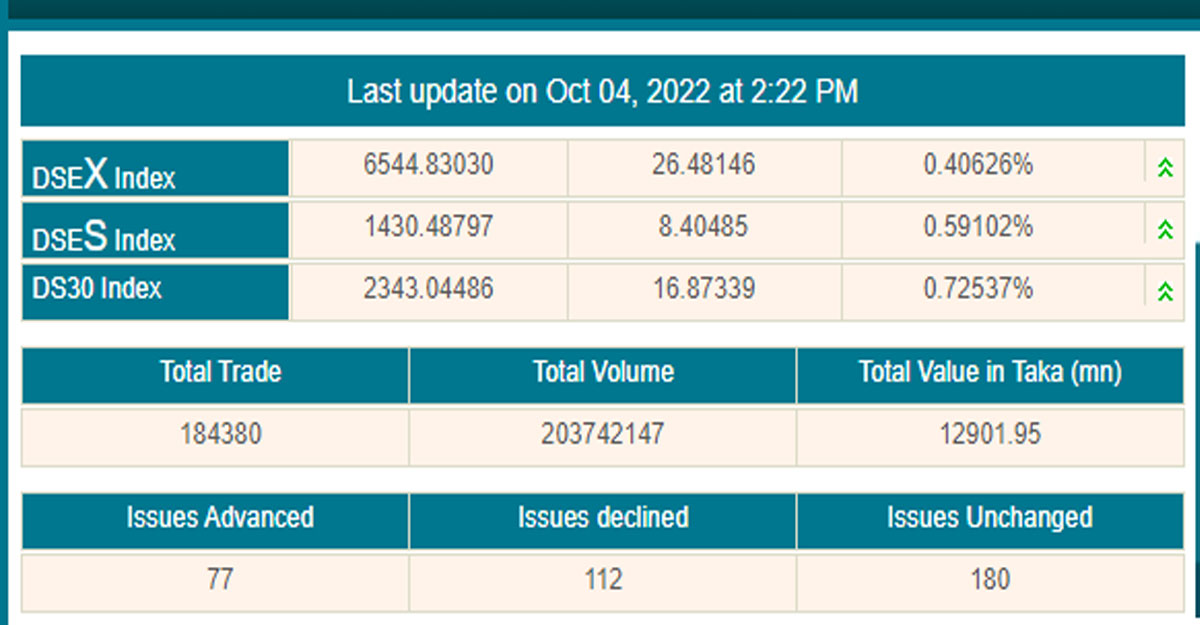 বাজারে লেনদেন হওয়া ৩৬৯টি প্রতিষ্ঠানের মধ্যে দাম বেড়েছে ৭৭টির, কমেছে ১১২টির, আর অপরিবর্তিত রয়েছে ১৮০টি প্রতিষ্ঠানের শেয়ার ও ইউনিটের দর। অধিকাংশ কোম্পানির শেয়ারের দাম কমার দিনে ডিএসইর প্রধান সূচক ডিএসইএক্স ২৬ পয়েন্ট বেড়ে ৬ হাজার ৫৪৪ পয়েন্টে দাঁড়িয়েছে। প্রধান সূচকের পাশাপাশি ডিএসইএস শরিয়াহ সূচক ৮ দশমিক ৪০ পয়েন্ট বেড়ে ১ হাজার ৪৩০ পয়েন্টে এবং ডিএস-৩০ সূচক ১৬ দশমিক ৮৭ পয়েন্ট বেড়ে ২ হাজার ৩৪৩ পয়েন্টে দাঁড়িয়েছে।