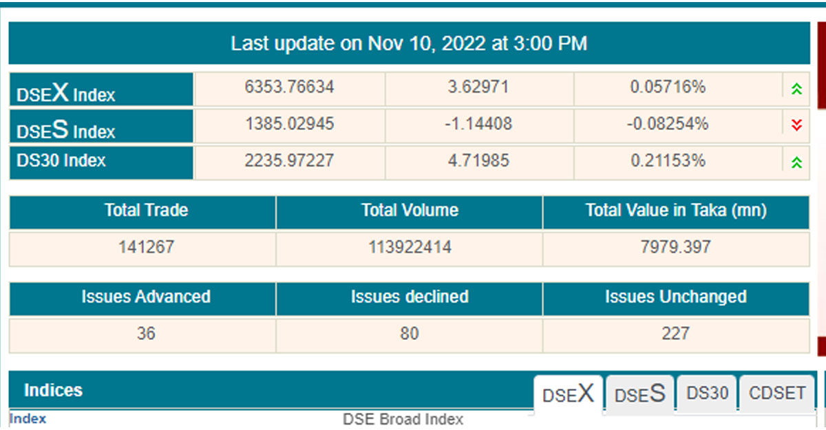 অপর দুই সূচকের মধ্যে ডিএসইএস শরিয়াহ সূচক আগের দিনের চেয়ে ১ পয়েন্ট কমে ১ হাজার ৩৮৫ পয়েন্ট এবং ডিএস-৩০ সূচক আগের দিনের চেয়ে ৪ দশমিক ৭১ পয়েন্ট বেড়ে ২ হাজার ২৩৫ পয়েন্ট পয়েন্টে দাঁড়িয়েছে।