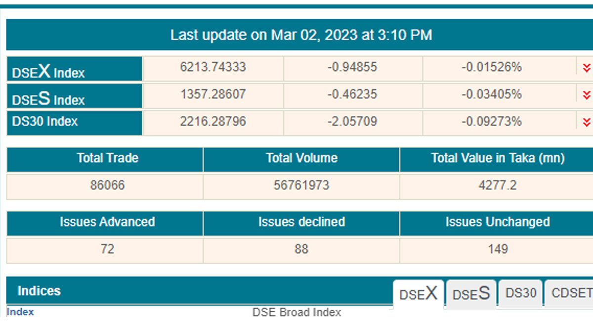 ডিএসইর প্রধান সূচক ডিএসইএক্স আগের দিনের চেয়ে দশমিক ৯৪ পয়েন্ট কমে দাঁড়িয়েছে ৬ হাজার ২১৩ পয়েন্টে। ডিএসইএস শরিয়াহ্ সূচক আগের দিনের তুলনায় দশমিক ৪৬ পয়েন্ট কমে ১ হাজার ৩৫৭ পয়েন্টে এবং ডিএসই-৩০ সূচক আগের দিনের তুলনায় ২ পয়েন্ট কমে ২ হাজার ২১৬ পয়েন্টে অবস্থান করছে।