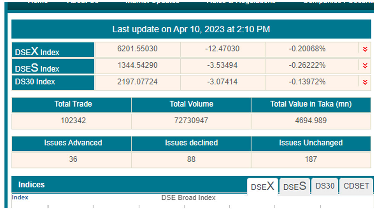 এ দিন প্রধান সূচক ডিএসইএক্স আগের দিনের চেয়ে ১২ দশমিক ৪৭ পয়েন্ট কমে ৬ হাজার ২০১ পয়েন্টে দাঁড়িয়েছে। ডিএসইর অপর দুই সূচকের মধ্যে ডিএসই শরীয়াহ সূচক ৩ দশমিক ৫৩ পয়েন্ট কমে দাঁড়িয়েছে ১ হাজার ৩৪৪ পয়েন্টে। ডিএসই ৩০ সূচক ৩ দশমিক ৭ পয়েন্ট কমে ২ হাজার ১৯৭ পয়েন্টে দাঁড়িয়েছে।