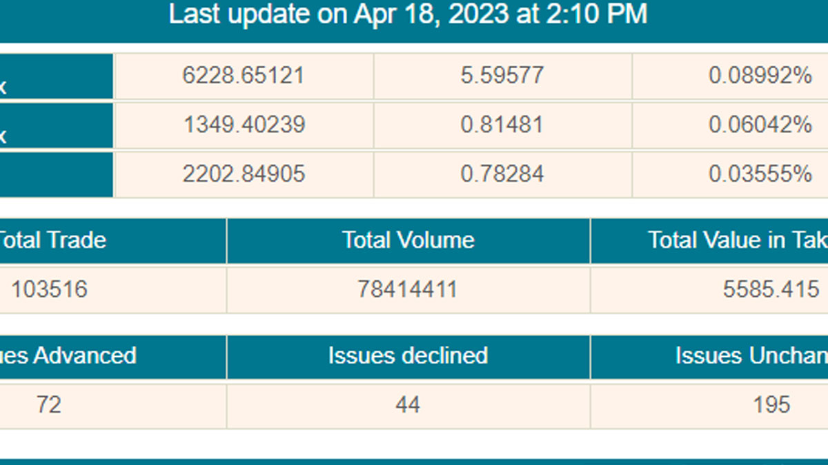 এদিন প্রধান সূচক ডিএসইএক্স আগের দিনের চেয়ে ৫ দশমিক ৬০ পয়েন্ট বেড়ে ৬ হাজার ২২৮ পয়েন্টে দাঁড়িয়েছে। ডিএসইর অপর দুই সূচকের মধ্যে ডিএসই শরীয়াহ সূচক দশমিক ৮১ পয়েন্ট বেড়ে দাঁড়িয়েছে ১ হাজার ৩৪৯ পয়েন্টে। ডিএসই ৩০ সূচক দশমিক ৭৮ পয়েন্ট বেড়ে ২ হাজার ২০২ পয়েন্টে দাঁড়িয়েছে।