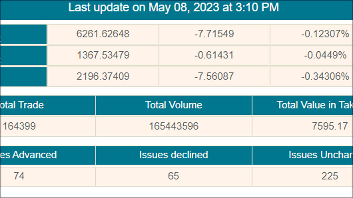 এদিন আগের দিনের চেয়ে ৭ দশমিক ৭১ পয়েন্ট কমে ৬ হাজার ২৬১ পয়েন্টে দাঁড়িয়েছে ডিএসইর প্রধান সূচক ডিএসইএক্স। ডিএসইর অপর দুই সূচকের মধ্যে ডিএসই শরীয়াহ সূচক দশমিক ৬১ পয়েন্ট কমে ১ হাজার ৩৬৭ পয়েন্টে দাঁড়িয়েছে। তবে ৭ দশমিক ৫৬ পয়েন্ট কমে ২ হাজার ১৯৬ পয়েন্টে দাঁড়িয়েছে ডিএসই ৩০ সূচক।