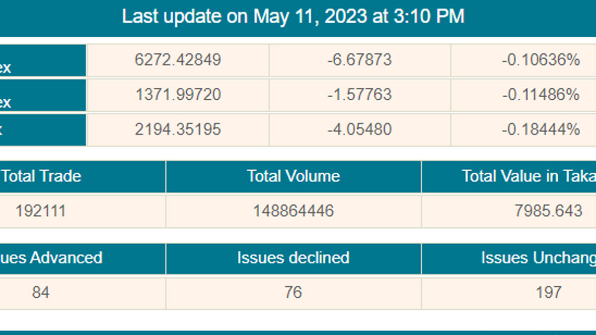এদিন আগের দিনের চেয়ে ৬ দশমিক ৬৭ পয়েন্ট কমে ৬ হাজার ২৭২ পয়েন্টে দাঁড়িয়েছে ডিএসইর প্রধান সূচক ডিএসইএক্স। ডিএসইর অপর দুই সূচকের মধ্যে ডিএসই শরীয়াহ সূচক ১ দশমিক ৫৭ পয়েন্ট কমে ১ হাজার ৩৭১ পয়েন্টে দাঁড়িয়েছে। ৪ পয়েন্ট কমে ২ হাজার ১৯৪ পয়েন্টে দাঁড়িয়েছে ডিএসই ৩০ সূচক।