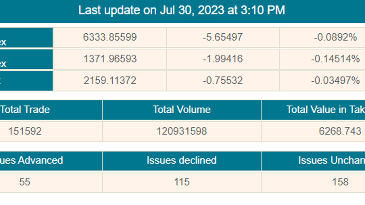 ডিএসইর প্রধান সূচক ডিএসইএক্স আগের দিনের চেয়ে ৫ দশমিক ৬৫ পয়েন্ট কমে দাঁড়িয়েছে ৬ হাজার ৩৩৩ পয়েন্টে। ডিএসইর অন্য দুই সূচকের মধ্যে ডিএসই শরীয়াহ সূচক ১ দশমিক ৯৯ পয়েন্ট কমে দাঁড়িয়েছে ১ হাজার ৩৭১ পয়েন্টে। ডিএস-৩০ সূচক দশমিক ৭৫ পয়েন্ট কমে দাঁড়িয়েছে ২ হাজার ১৫৯ পয়েন্টে।