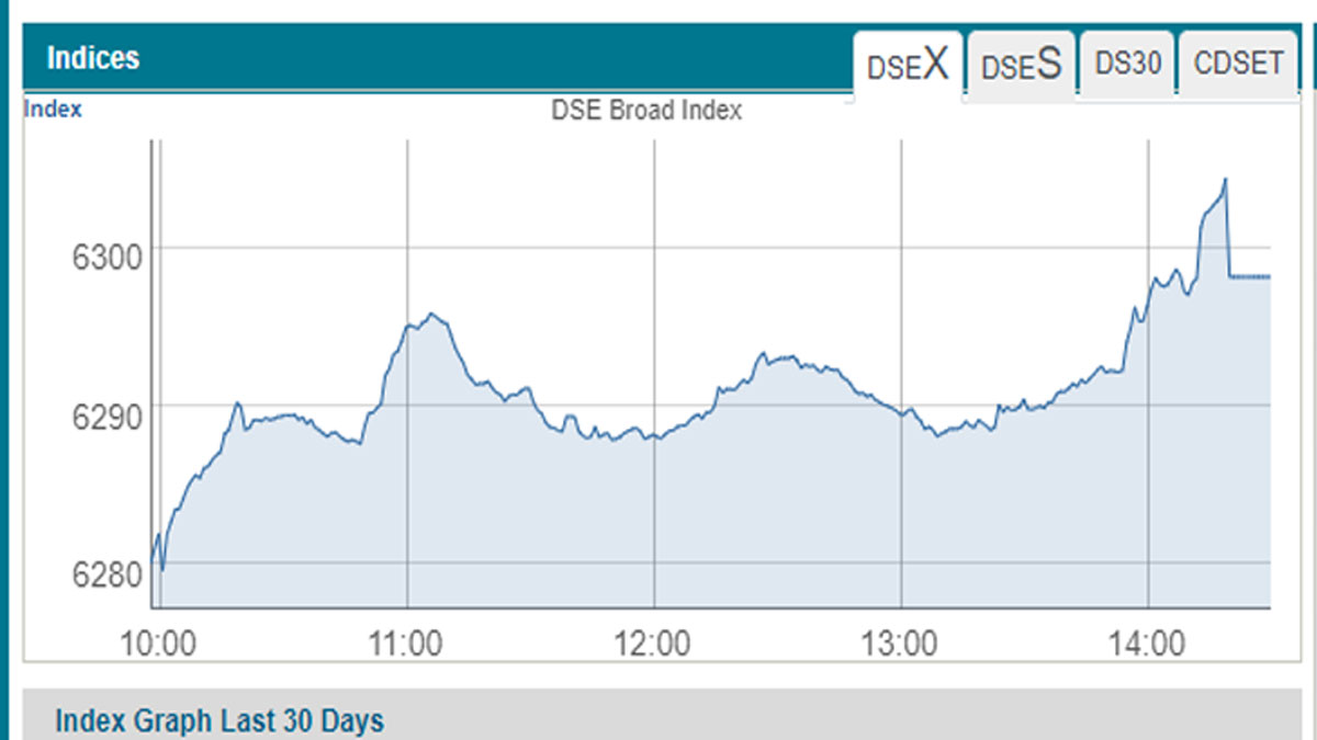 এ দিন ডিএসইতে লেনদেন হওয়া ৩৩৩টি প্রতিষ্ঠানের মধ্যে ৩২ টি কোম্পানির শেয়ারের দাম কমেছে। তার বিপরীতে বেড়েছে ১২১টি কোম্পানির শেয়ার। আর অপবির্তিত রয়েছে ১৮০ কোম্পানির শেয়ার। তাতে ডিএসইর প্রধান সূচক ডিএসইএক্স আগের দিনের চেয়ে ১৮ দশমিক ১৪ পয়েন্ট বেড়ে দাঁড়িয়েছে ৬ হাজার ২৯৮ পয়েন্টে। ডিএসইর অন্য দুই সূচকের মধ্যে ডিএসইএস শরীয়াহ সূচক ৫ দশমিক ২৭ পয়েন্ট বেড়ে দাঁড়িয়েছে ১ হাজার ৩৭১ পয়েন্টে। আর ডিএস-৩০ সূচক ৯ দশমিক ৬৬ পয়েন্ট বেড়ে দাঁড়িয়েছে ২ হাজার ১৪০ পয়েন্টে।