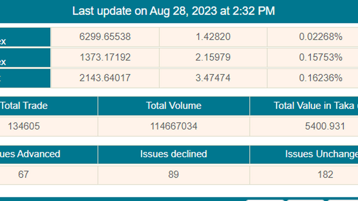 তাতে ডিএসইর প্রধান সূচক ডিএসইএক্স আগের দিনের চেয়ে ১ দশমিক ৪২ পয়েন্ট বেড়ে দাঁড়িয়েছে ৬ হাজার ২৯৯ পয়েন্টে। ডিএসইর অন্য দুই সূচকের মধ্যে ডিএসইএস শরীয়াহ সূচক ২ দশমিক ১৫ পয়েন্ট বেড়ে দাঁড়িয়েছে ১ হাজার ৩৭৩ পয়েন্টে। আর ডিএস-৩০ সূচক ৩ দশমিক ৪৭ পয়েন্ট বেড়ে দাঁড়িয়েছে ২ হাজার ১৪৩ পয়েন্টে।