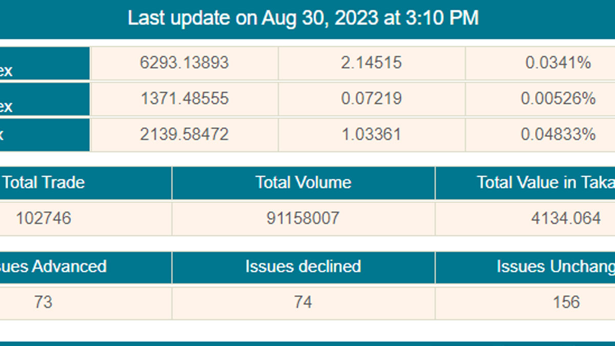 তাতে ডিএসইর প্রধান সূচক ডিএসইএক্স আগের দিনের চেয়ে ২ দশমিক ১৪ পয়েন্ট বেড়ে দাঁড়িয়েছে ৬ হাজার ২৯৩ পয়েন্টে। ডিএসইর অন্য দুই সূচকের মধ্যে ডিএসইএস শরীয়াহ সূচক দশমিক ৭ পয়েন্ট বেড়ে দাঁড়িয়েছে ১ হাজার ৩৭১ পয়েন্টে। আর ডিএস-৩০ সূচক ১ দশমিক ৩ পয়েন্ট বেড়ে দাঁড়িয়েছে ২ হাজার ১৩৯ পয়েন্টে।