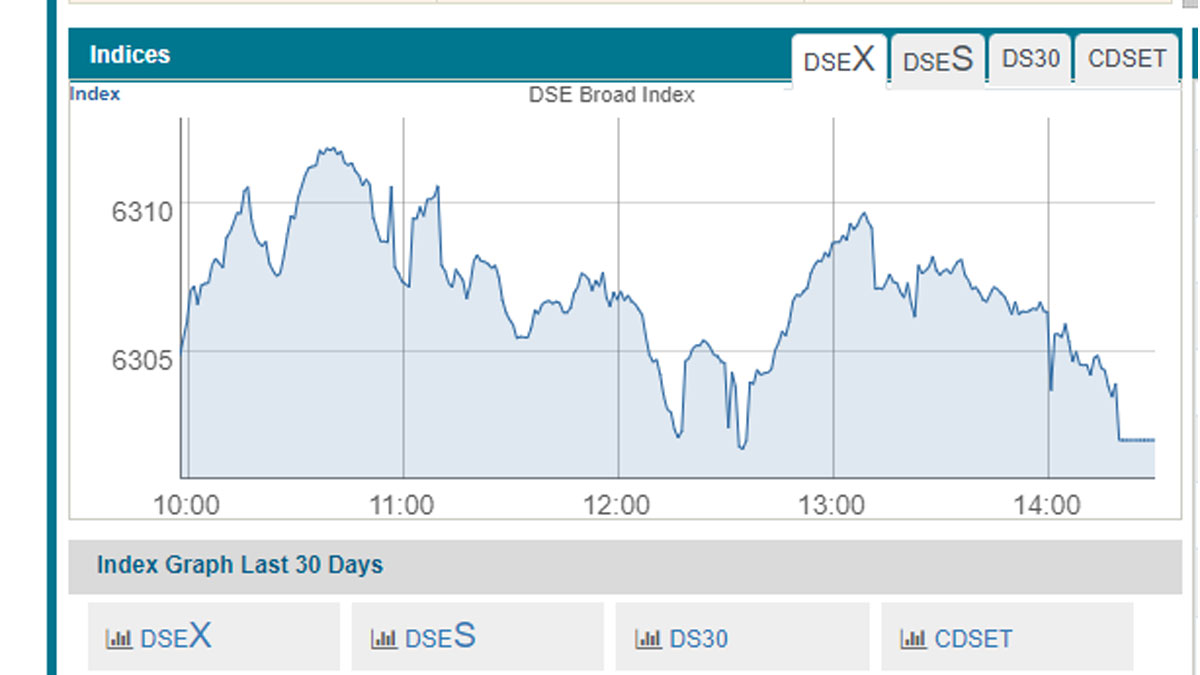 তাতে ডিএসইর প্রধান সূচক ডিএসইএক্স আগের দিনের চেয়ে ২ দশমিক ৮৫ পয়েন্ট কমে দাঁড়িয়েছে ৬ হাজার ৩০২ পয়েন্টে। ডিএসইর অন্য দুই সূচকের মধ্যে ডিএসইএস শরীয়াহ সূচক ২ দশমিক ৮৬ পয়েন্ট কমে দাঁড়িয়েছে ১ হাজার ৩৬০ পয়েন্টে। ডিএস-৩০ সূচক ৩ দশমিক ৩ পয়েন্ট কমে দাঁড়িয়েছে ২ হাজার ১৩৪ পয়েন্টে।