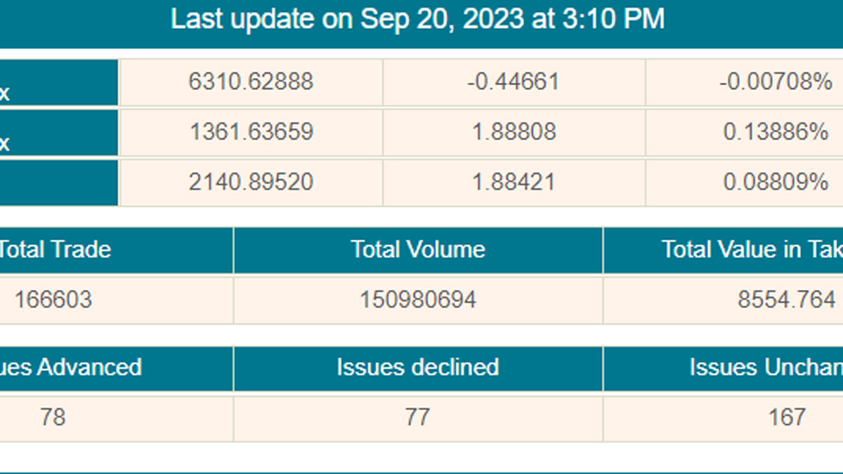 ডিএসইর দেওয়া তথ্য মতে, বুধবার বাজারে লেনদেন হওয়া ৩২২টি কোম্পানির মধ্যে দাম বেড়েছে ৭৮টির, কমেছে ৭৭টির আর অপরিবর্তিত রয়েছে ১৬৭টি কোম্পানির শেয়ারের দাম। তাতে ডিএসইর প্রধান সূচক ডিএসইএক্স আগের দিনের চেয়ে দশমিক ৪৪ পয়েন্ট কমে দাঁড়িয়েছে ৬ হাজার ৩১০ পয়েন্টে। ডিএসইর অন্য দুই সূচকের মধ্যে ডিএসইএস শরীয়াহ সূচক ১ দশমিক ৮৮ পয়েন্ট বেড়ে দাঁড়িয়েছে ১ হাজার ৩৬১ পয়েন্টে। ডিএস-৩০ সূচক ১ দশমিক ৮৮ পয়েন্ট বেড়ে দাঁড়িয়েছে ২ হাজার ১৪০ পয়েন্টে।