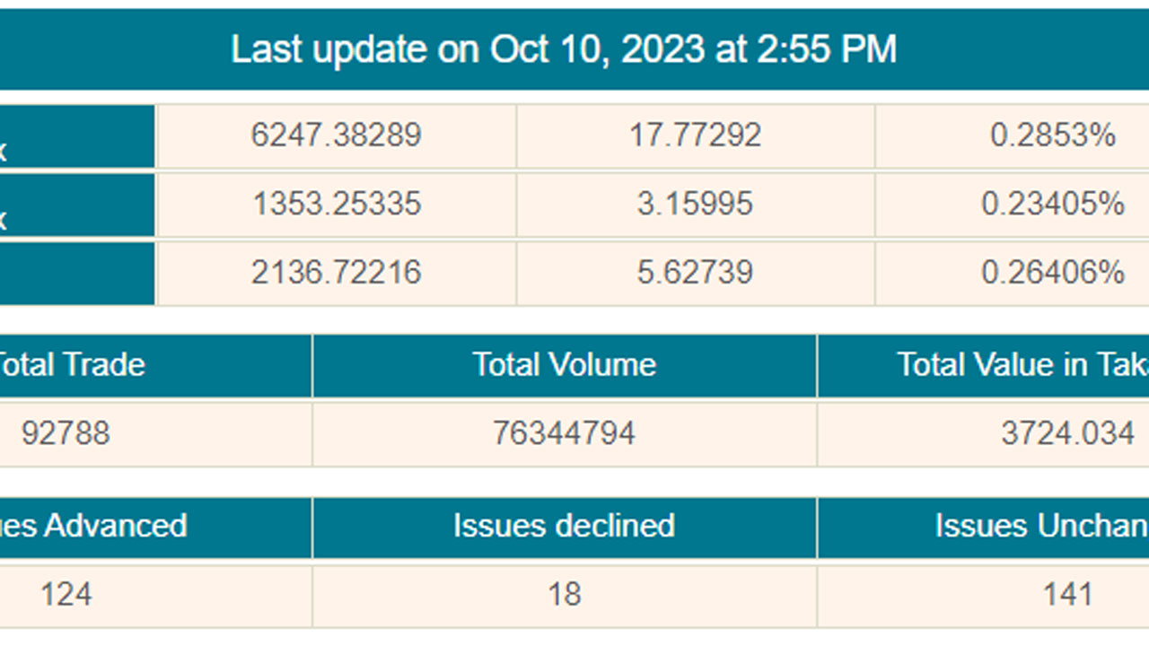 ডিএসইর তথ্য মতে, মঙ্গলবার ডিএসইর প্রধান সূচক ডিএসইএক্স আগের দিনের চেয়ে ১৭ দশমিক ৭৭ পয়েন্ট বেড়ে ৬ হাজার ২৪৭ পয়েন্টে দাঁড়িয়েছে। প্রধান সূচকের পাশাপাশি অন্য দুই সূচকের মধ্যে ডিএসইএস শরীয়াহ সূচক ৩ দশমিক ১৫ পয়েন্ট বেড়ে দাঁড়িয়েছে ১ হাজার ২৫৩ পয়েন্টে। ডিএস-৩০ সূচক ৫ দশমিক ৬২ পয়েন্ট বেড়ে দাঁড়িয়েছে ২ হাজার ১৩৬ পয়েন্টে।