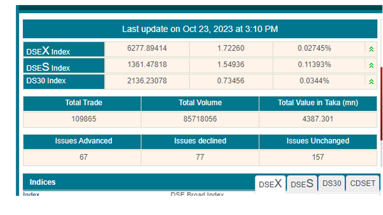 ডিএসইর প্রধান সূচক ডিএসইএক্স আগের দিনের চেয়ে ১ দশমিক ৭২ পয়েন্ট বেড়ে ৬ হাজার ২৭২ পয়েন্টে দাঁড়িয়েছে। প্রধান সূচকের পাশাপাশি অন্য দুই সূচকের মধ্যে ডিএসইএস শরীয়াহ সূচক ১ দশমিক ৫৪ পয়েন্ট বেড়ে দাঁড়িয়েছে ১ হাজার ৩৬১ পয়েন্টে। ডিএস-৩০ সূচক দশমিক ৭৩ পয়েন্ট বেড়ে দাঁড়িয়েছে ২ হাজার ১৩৬ পয়েন্টে।