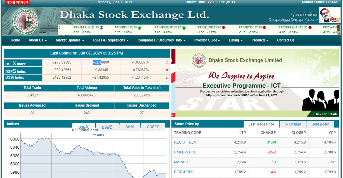 বেশির ভাগ শেয়ারের দাম কমায় এদিন আগের দিনের তুলনায় ডিএসইর প্রধান সূচক ডিএসইএক্স ৬২ দশমিক ৩৯ পয়েন্ট কমে পাঁচ হাজার ৯৭৫ পয়েন্টে দাঁড়িয়েছে। প্রধান সূচকের পাশাপাশি ডিএসইর অন্য সূচকগুলোর মধ্যে শরিয়াহ সূচক ৯ দশমিক ৮৮ পয়েন্ট কমে ১ হাজার ২৮৯ পয়েন্টে এবং ডিএসই-৩০ সূচক ২৭ দশমিক ৪২ পয়েন্ট কমে ২ হাজার ১৯৫ পয়েন্টে অবস্থান করছে।