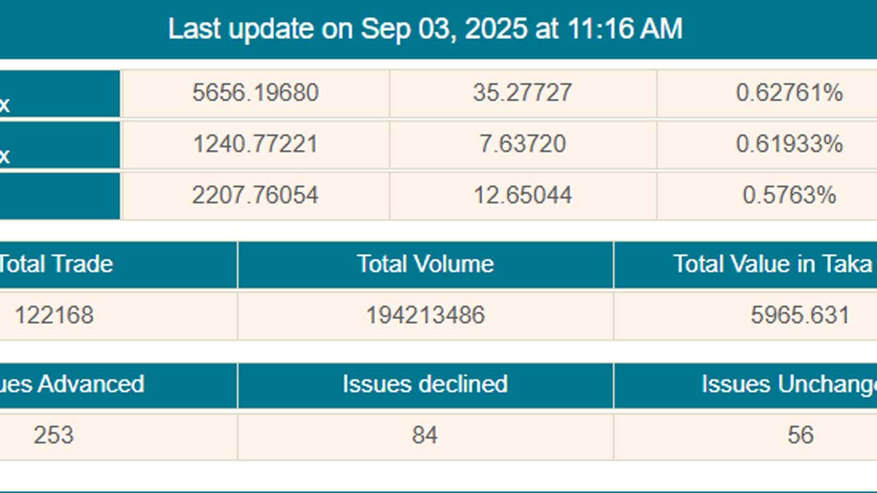দেশের প্রধান পুঁজিবাজার ঢাকা স্টক এক্সচেঞ্জে (ডিএসই) সপ্তাহের চতুর্থ কার্যদিবস বুধবার (৩ সেপ্টেম্বর) সবগুলো মূল্য সূচকের উত্থানে লেনদেন চলছে। এদিন বেলা ১১টা পর্যন্ত প্রথম ঘণ্টায় লেনদেনে অংশ নেওয়া সিকিউরিটিজগুলোর মধ্যে দ্বিগুণের বেশি সংখ্যকের দর বেড়েছে। প্রথম ঘণ্টায় এক্সচেঞ্জটির লেনদেন ৫শ’ কোটি ছাড়িয়ে গেছে।