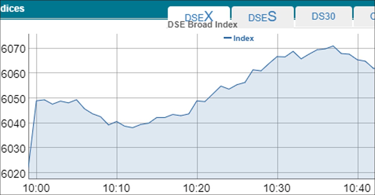 এদিন লেনদেনের প্রথম আধা ঘণ্টায় (সকাল সাড়ে ১০টা পর্যন্ত) দেশের প্রধান পুঁজিবাজার ঢাকা স্টক এক্সচেঞ্জে (ডিএসই) সূচক বেড়েছে ৪৫ পয়েন্ট। অপর পুঁজিবাজার চট্টগ্রাম স্টক এক্সচেঞ্জে (সিএসই) সূচক বেড়েছে ৭১ পয়েন্ট। সূচকের পাশাপাশি লেনদেন ও বেশির ভাগ কোম্পানির শেয়ারের দামও বাড়ছে।