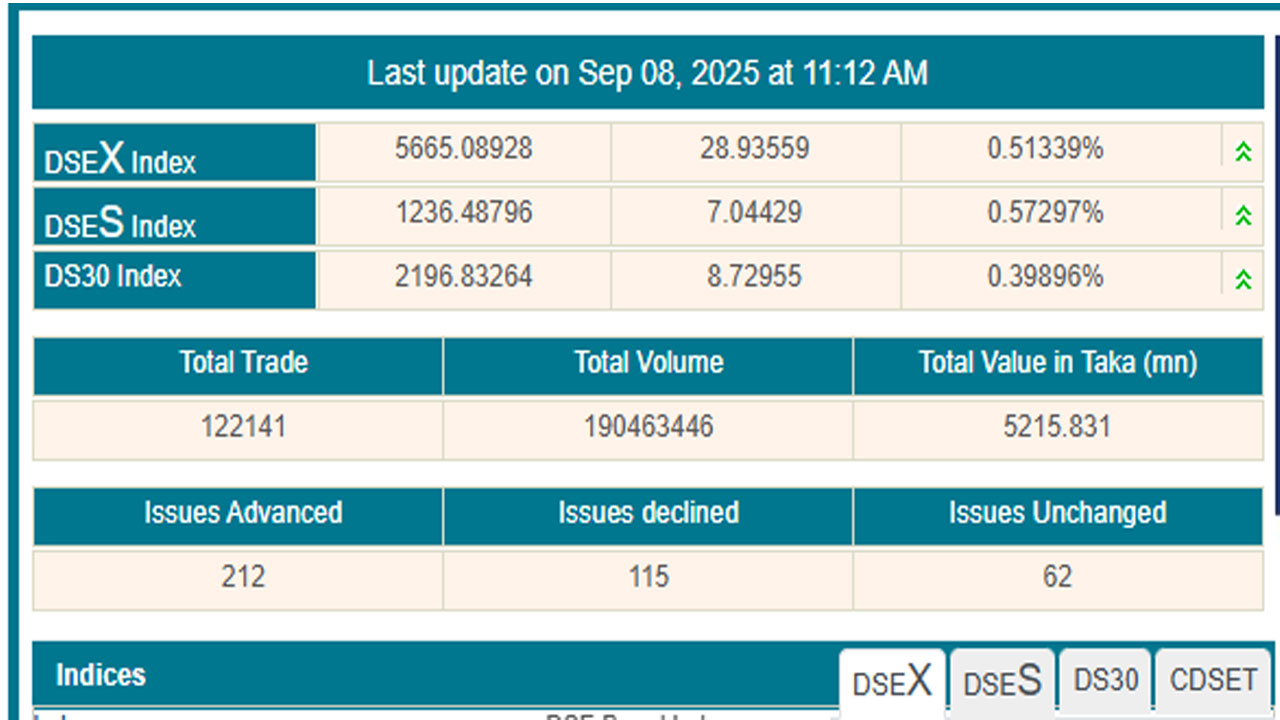 বাজার বিশ্লেষণে দেখা গেছে, বেলা ১১টা পর্যন্ত ঢাকার এই পুঁজিবাজারের প্রধান মূল্যসূচক ডিএসইএক্স আগের দিনের তুলনায় ৩৮ পয়েন্ট বেড়ে ৫ হাজার ৬৭৪ পয়েন্টে দাঁড়িয়েছে। আর শরীয়াহ কোম্পানিগুলোর সূচক ডিএসইএস ৯ পয়েন্ট বেড়ে এক হাজার ২৩৮ পয়েন্টে অবস্থান করছে। এছাড়া বাছাই করা ভালো ৩০ কোম্পানি নিয়ে গঠিত ডিএসই-৩০ সূচক আগের দিনের তুলনায় ১৩ পয়েন্ট বেড়ে ২ হাজার ২০১ পয়েন্টে উঠেছে।