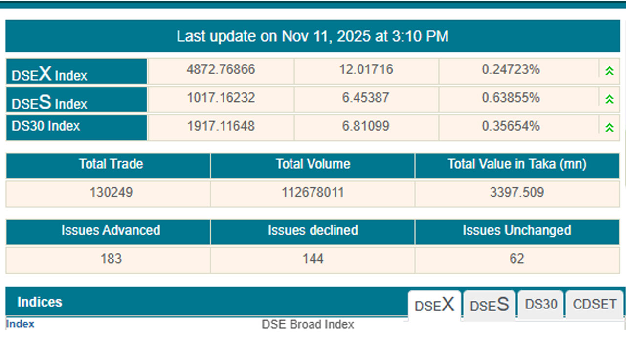 টানা ৭ কার্যদিবস দরপতন হওয়ার পর দেশের প্রধান পুঁজিবাজার ঢাকা স্টক এক্সচেঞ্জে (ডিএসই) সপ্তাহের তৃতীয় কার্যদিবস মঙ্গলবার (১১ নভেম্বর) অধিকাংশ শেয়ার ও ইউনিটের দর বেড়েছে। এতে সাতদিন পর এক্সচেঞ্জটির সবগুলো মূল্যসূচকও বেড়েছে। তবে এক্সচেঞ্জটির লেনদেন দিনের ব্যবধানে আরো কমে সাড়ে ৪ মাসের সর্বনিম্ন অবস্থানে নেমেছে।