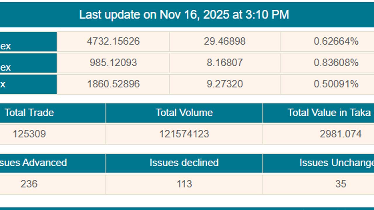 দেশের প্রধান পুঁজিবাজার ঢাকা স্টক এক্সচেঞ্জে (ডিএসই) সপ্তাহের প্রথম কার্যদিবস রোববার (১৬ নভেম্বর) অধিকাংশ শেয়ার ও ইউনিটের দর বেড়েছে। এতে এক্সচেঞ্জটির সবগুলো সূচক বেড়েছে। সূচক বাড়লেও লেনদেনে কিছুটা ভাটা পড়েছে। এক্সচেঞ্জটির লেনদেন ২০০ কোটি টাকার ঘরে নেমে এসেছে। দেশের অপর পুঁজিবাজারে চট্টগ্রাম স্টক এক্সচেঞ্জে (সিএসই) দরপতনের তালিকায় ছিল বেশিরভাগ প্রতিষ্ঠান। ফলে বাজারটিতে মূল্যসূচকের পতন হয়েছে। সেই সঙ্গে কমেছে লেনদেনের পরিমাণও।