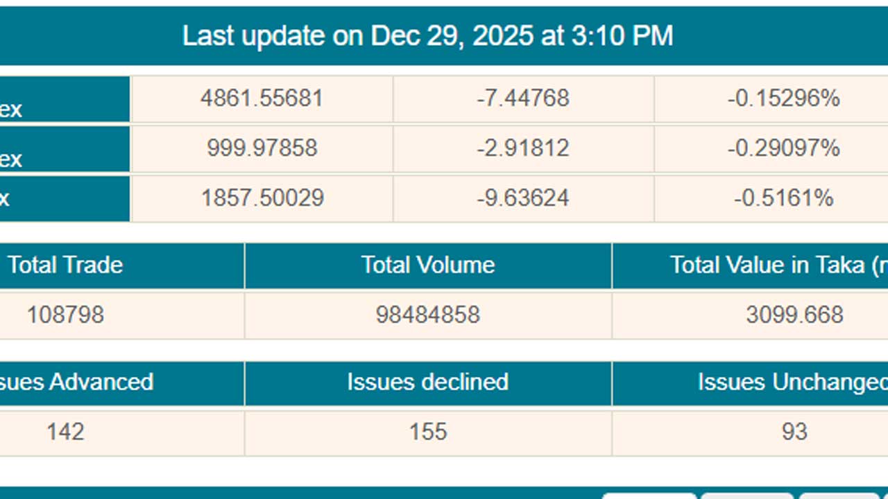 এতে ডিএসইর প্রধান মূল্যসূচক ডিএসইএক্স আগের দিনের তুলনায় ৭ পয়েন্ট কমে ৪ হাজার ৮৬১ পয়েন্টে দাঁড়িয়েছে। অন্য দুই সূচকের মধ্যে ডিএসই শরিয়াহ সূচক ২ পয়েন্ট কমে ৯৯৯ পয়েন্টে অবস্থান করছে। আর বাছাই করা ভালো ৩০ কোম্পানি নিয়ে গঠিত ডিএসই-৩০ সূচক আগের দিনের তুলনায় ৯ পয়েন্ট কমে ১ হাজার ৮৫৭ পয়েন্টে নেমে গেছে।