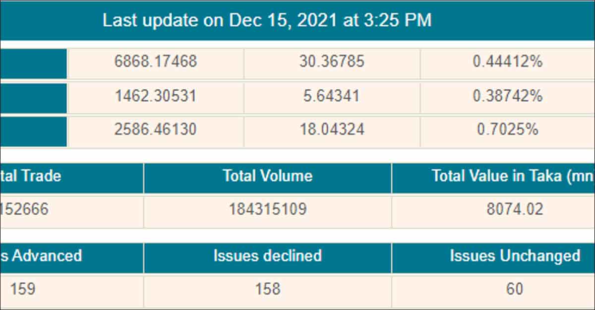 ডিএসইর তথ্য অনুযায়ী, বুধবার বাজারে ৩৭৭টি প্রতিষ্ঠানের শেয়ার ও ইউনিটের লেনদেন হয়েছে। এর মধ্যে দাম বেড়েছে ১৫৯টির, কমেছে ১৫৮টির, আর অপরিবর্তিত রয়েছে ৬০টি প্রতিষ্ঠানের শেয়ারের দাম। এতে ডিএসইর প্রধান সূচক ৩০ পয়েন্ট বেড়ে ৬ হাজার ৮৬৮ পয়েন্টে দাঁড়িয়েছে। ডিএসইএক্স সূচক আগের দিনের চেয়ে বেড়েছে ৫ পয়েন্ট, আর ডিএস-৩০ সূচক বেড়েছে ১৮ পয়েন্ট।