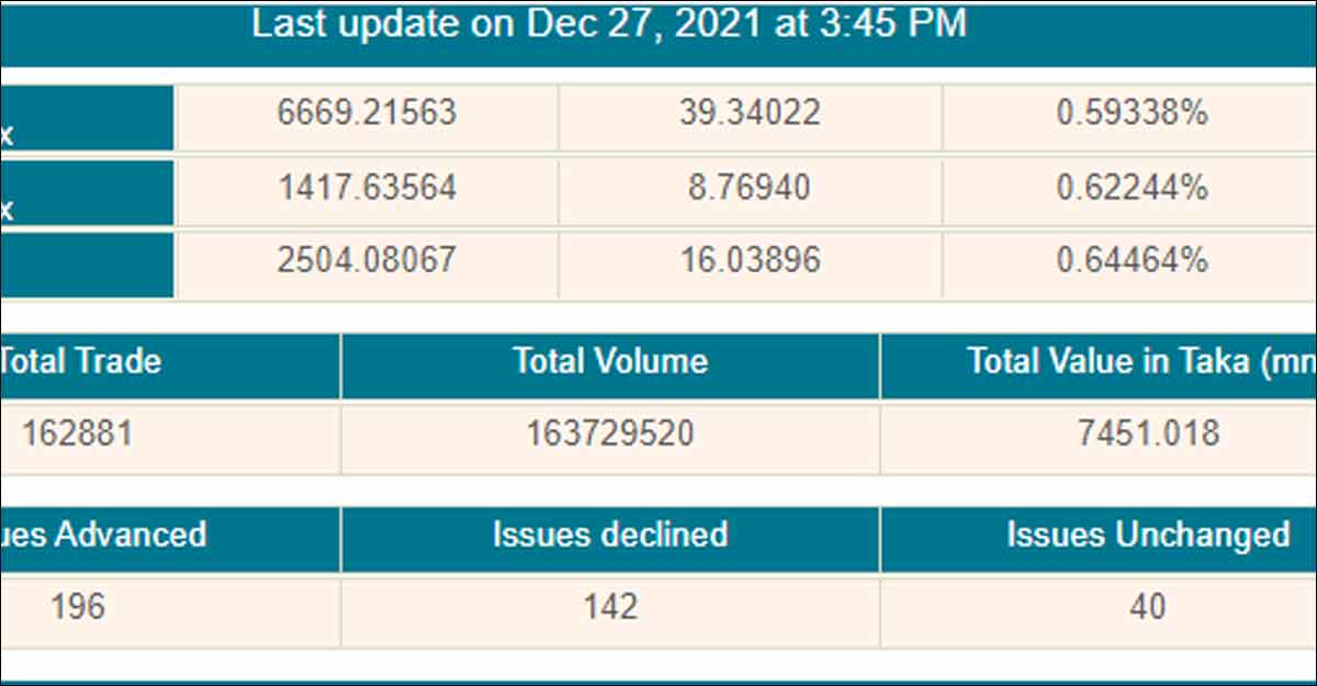 ডিএসইর তথ্য অনুযায়ী, এদিন বাজারে ৩৭৬টি প্রতিষ্ঠানের ১৬ কোটি ৩৭ লাখ ২৯ হাজার ৫২০টি শেয়ার ও ইউনিটের লেনদেন হয়েছে। এর মধ্যে ১৯৬টি প্রতিষ্ঠানের শেয়ার ও ইউনিটের দাম বেড়েছে, কমেছে ১৪২টির, আর অপরিবর্তিত রয়েছে ৪০টির।