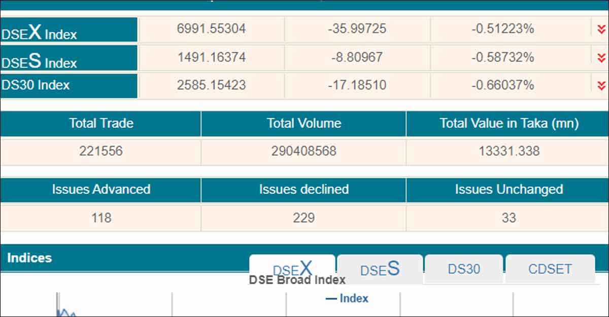 ফলে দিনশেষে ডিএসইর প্রধান সূচক ৩৫ দশমিক ৯৯ পয়েন্ট কমে ৬ হাজার ৯৯১ পয়েন্টে দাঁড়িয়েছে। ডিএসইএক্স সূচক আগের দিনের চেয়ে কমেছে ৮ দশমিক ৮০ পয়েন্ট এবং ডিএস-৩০ সূচক কমেছে ১৭ দশমিক ১৮ পয়েন্ট।