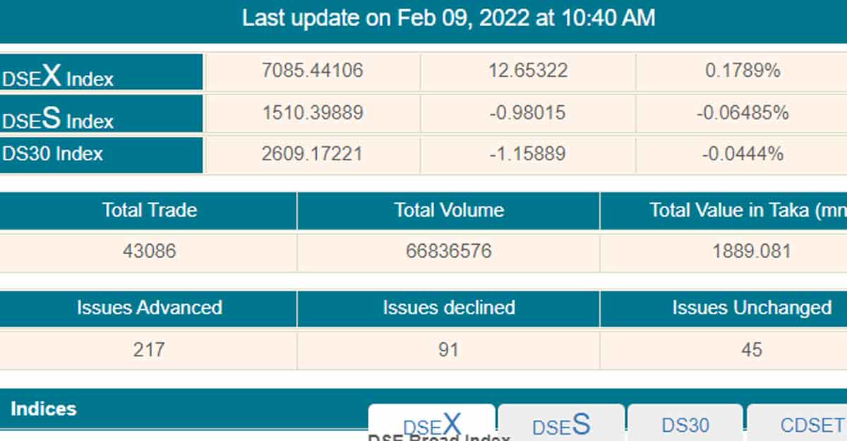 ডিএসইর তথ্য অনুযায়ী, সকাল ১০টা থেকে সাড়ে ১০টা পর্যন্ত সময়ে ৩৩৬টি প্রতিষ্ঠানের শেয়ার ও ইউনিট লেনদেন হয়েছে। এর মধ্যে ২১১টি প্রতিষ্ঠানের শেয়ারের দাম বেড়েছে, কমেছে ৮০টির ও অপরিবর্তিত রয়েছে ৪৫টির দাম।